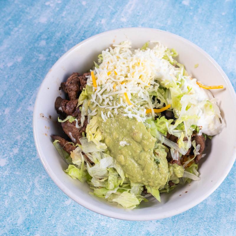 Crunchy bowl filled with lettuce, seasoned beef, pico de gallo, arroz blanco, black beans, corn, cheddar cheese and sour cream.