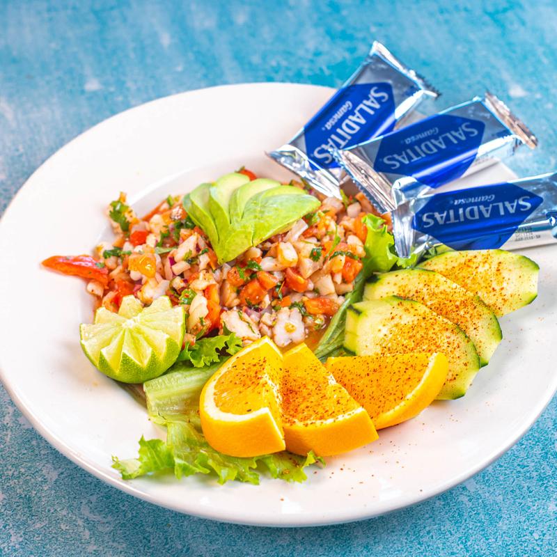 Shrimp made Mexican-Style in our special sauce of tomatoes, onions, peppers, and cucumbers. Garnished with sliced avocado and served with crackers.
