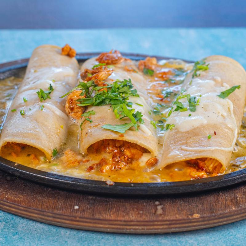 3 corn tortillas stuffed with chicken and spinach, topped with our delicious roasted poblano salsa and fresh cheese, served with rice.