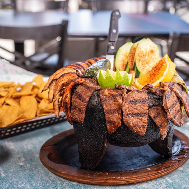 Steak, chicken, shrimp and chorizo served inside of a pineapple, topped with melted cheese.