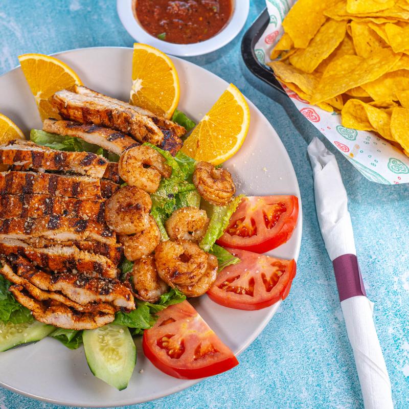 Tender grilled rib eye steak and grilled chicken breast served with rice, beans, pico de gallo, salad and tortillas.