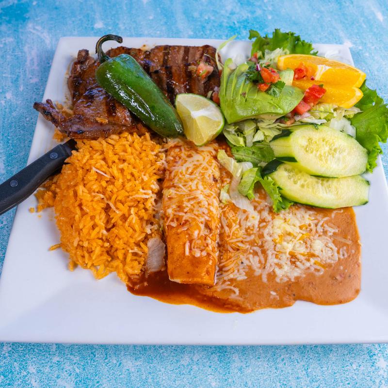 Mexico City-style choice strips of steak served with rice, beans and a cheese enchilada with salad.