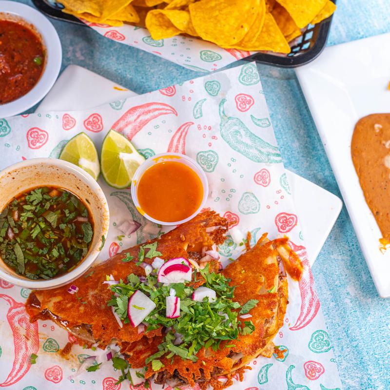 Two tacos filled with the heartiest of beef, cooked in our unique birria sauce. Served with consomme (beef broth) for dipping tacos. Served with rice and beans